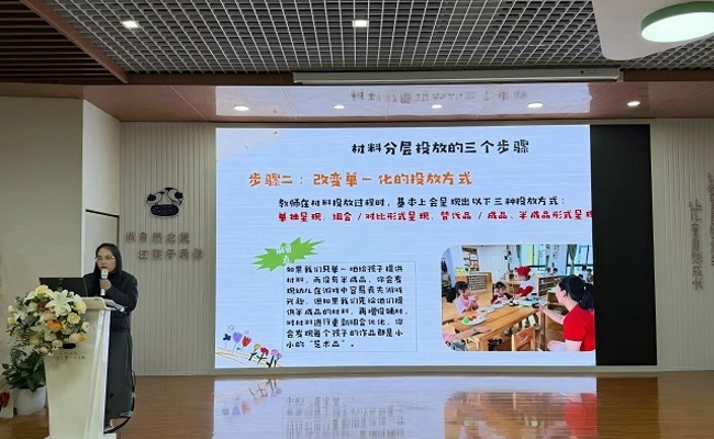 活动最后,余敏老师分享了材料层次性投放的实用策略和材料分层投放的实操步骤,为教师后续的区域材料优化提供了清晰的行动框架。