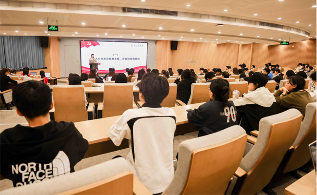 为深入诠释红色财经精神和伟大抗战精神的深刻内涵,把锲而不舍落实中央八项规定精神融入青春誓言。根据《关于举办2025年“微党课”比赛的通知》(广商党委〔2025〕30号)工作安排,11月12日晚,广州商学院党委在广州商学院求真楼八教102报告厅组织举办以“弘扬伟大抗战精神,勇担民族复兴重任”与“讲述百年财经故事,传承红色文化基因”为双主题的“微党课”比赛(学生组)决赛。本次比赛邀请了党委宣传部部长关俊明、党群工作部副部长伍有才、品牌宣传部副部长黄玉亭、马克思主义学院副教授李锦堂、马克思主义学院副教授邓冬丽担任评委。各二级学院学生党支部书记、组织员和学生代表们共计110余人到场观摩比赛。
