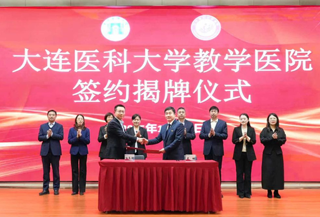 刘莹、段颖共同为大连医科大学教学医院揭牌,孙志波与罗钢分别代表双方签署教学合作协议。