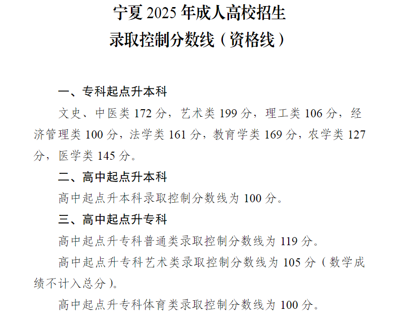 宁夏2025年成人高校招生录取控制分数线(资格线)