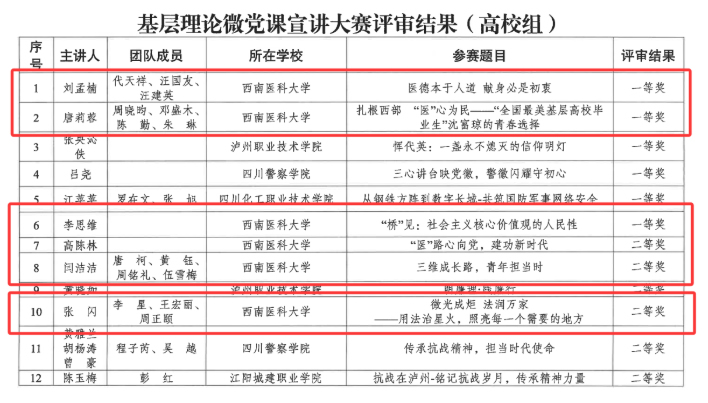近日,市委教育工委、市教体局党组公布全市教育系统第二届“酒城师说”基层理论微党课宣讲大赛获奖名单,西南医科大学获一等奖3项、二等奖3项,其中中西医结学院·附属中医医院党委选送的《医德本于人道 献身必是初衷》、外国语学院党委选送的《扎根西部 “医”心为民——全国最美基层高校毕业生沈富琼的青春选择》、马克思主义学院党委选送的《“桥”见:社会主义核心价值观的人民性》3个作品获一等奖,临床医学院·附属医院党委选送的《“医”路心向党,建功新时代》、口腔医学院·附属口腔医院党委选送的《三维成长路,青年担当时》、法学院党委选送的《微光成炬 法润万家——用法治星火,照亮每一个需要的地方》3个作品获二等奖。