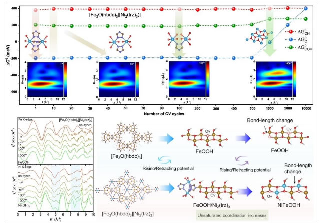 针对这一领域难题,研究提出了MOF重构的时空异步调控策略,通过轨道耦合的孔道微环境驱动空间分离的铁/镍金属节点发生分阶段动力学重构。团队集成了原位X射线吸收光谱(In-situ XAS)、原位拉曼光谱与实时反应动力学追踪的多模态原位表征平台,揭示了重构过程的调控机制及跨尺度动力学规律。首次在原子-介观尺度上清晰揭示了MOF从铁基活性相到镍铁基高活性相的重构动力学实时监测,功能分区的孔道结构强化了铁-镍节点间的协同作用,而自适应缺陷、键弛豫及结构再生效应共同调控了催化动力学行为,最终实现了析氧反应活性的显著提升。这种动态追踪方法将MOF重构的时空调控与多尺度动态追踪相结合的创新方法,不仅深化了对析氧反应(OER)催化剂动态行为的基础认知,还为MOF催化剂的设计提供了全新范式。
