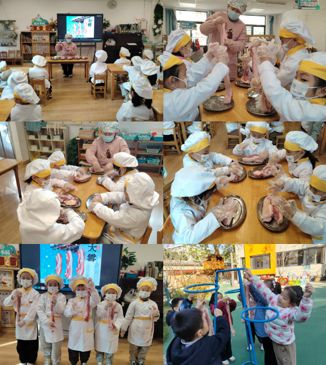 冬腊风腌,蓄以御冬”,大雪腌腊肉是历史悠久的民俗。老师们提前准备了新鲜五花肉、食盐、酱油、八角、桂皮等材料,带领孩子们亲手体验腌肉过程。孩子们先认识各类食材,接着在老师的指导下为五花肉抹盐、撒香料,最后将肉装入密封罐中。看着自己制作的腊肉,孩子们脸上洋溢着成就感,也在实践中体会到传统饮食文化的韵味与古人的生活智慧。