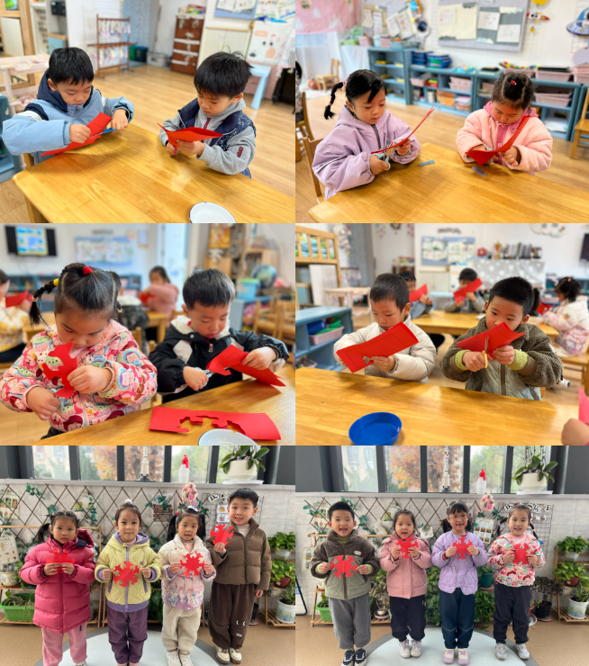 冬日雪景是大自然的馈赠,也是孩子们眼中最美的画面。在艺术创作环节,孩子们用灵巧的双手剪出一片片雪花。对折、裁剪、展开……普通的彩纸变成形态各异、晶莹剔透的雪花,仿佛把冬日的浪漫带进了教室。