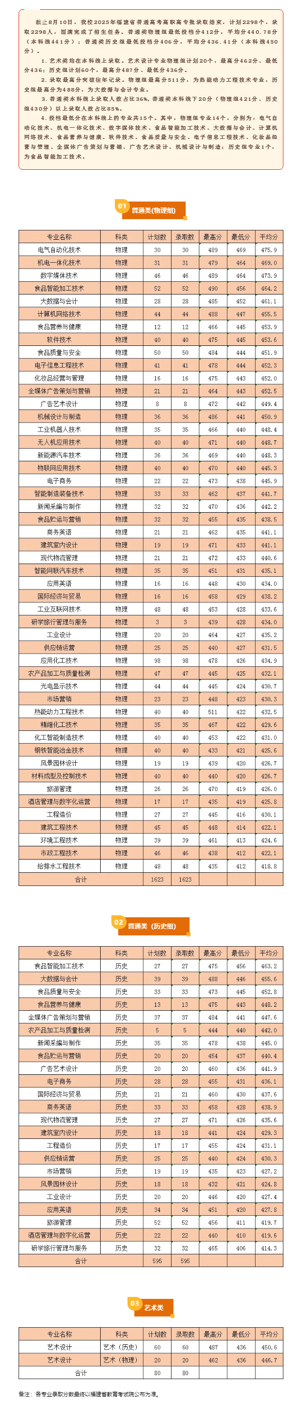 漳州职业技术学院2025年福建省普通高考录取情况