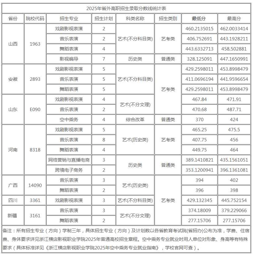 浙江横店影视职业学院2025年省外高职招生录取分数线统计表