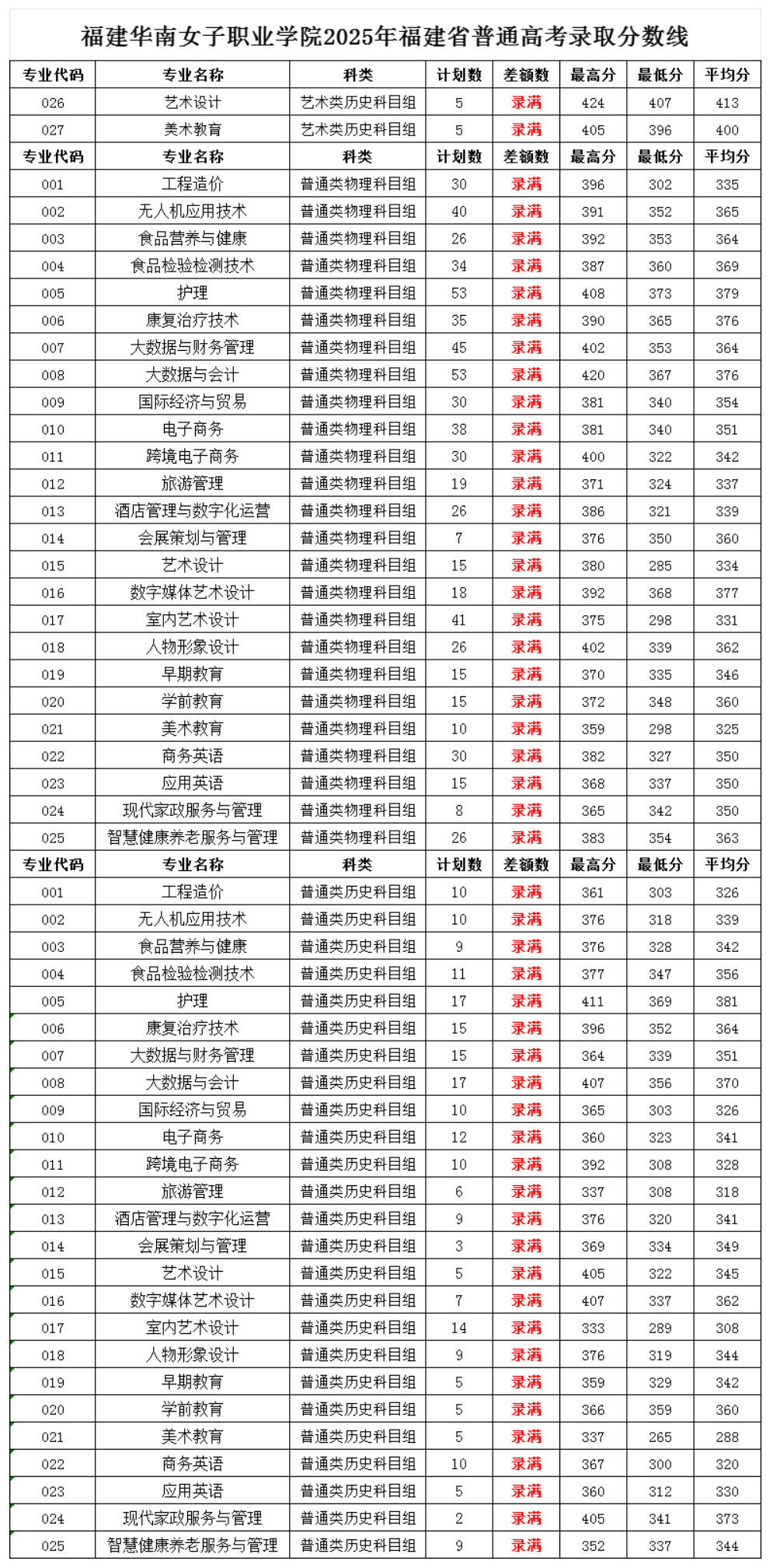 福建华南女子职业学院2025年福建省普通高考录取分数线