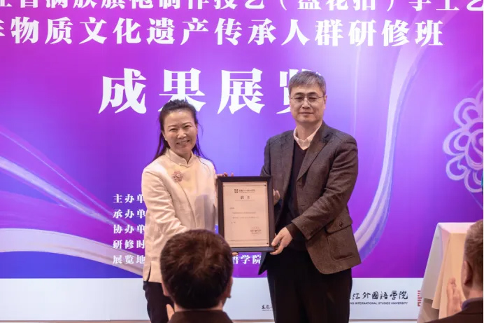 结业式现场,黑龙江省文化和旅游厅非遗处处长李庆江和黑龙江外国语学院艺术学院教学副院长林世军分别为表现突出的优秀学员颁发了荣誉证书。优秀学员代表在发言中分享了将传统技艺与现代设计思维融合的创作心得,表达了扎根地方、持续传播非遗文化的信心与决心。随后,黑龙江外国语学院副校长李云波向贾淑娟大师颁发了客座教授聘书。