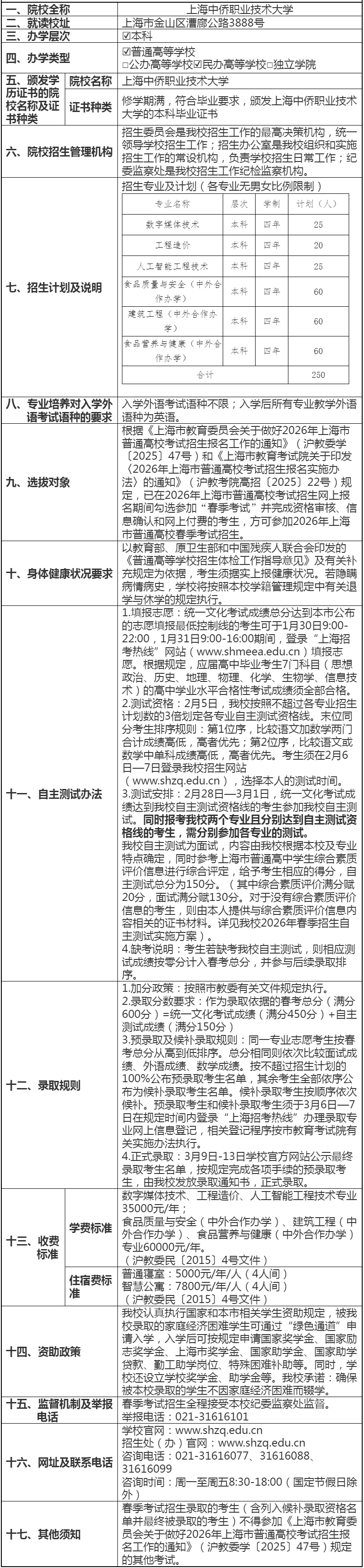 上海中侨职业技术大学2026年春季考试招生章程