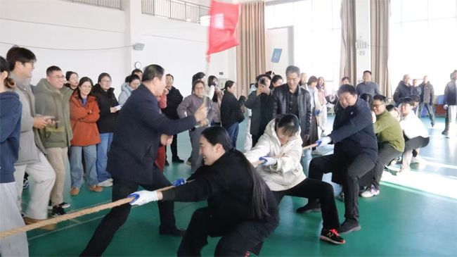 为深入贯彻落实全民健身国家战略,丰富校园文化生活,增强教职工团队凝聚力与集体荣誉感,营造积极向上、团结协作的校园氛围,2025年12月25日,由山东城市建设职业学院团委、工会、基础教学部联合举办的第一届教职工拔河比赛在乒羽楼成功开拔。本次比赛以“凝心聚力,绳系你我”为主题,以青年理论学习小组为人员基础,由全校各系部、处室和组建了十支队伍参赛,吸引百余名教职工踊跃参与。学校党委副书记、院长张国强,党委副书记高绍远,党委委员、副院长王加胜出席并全程为大家加油助威。