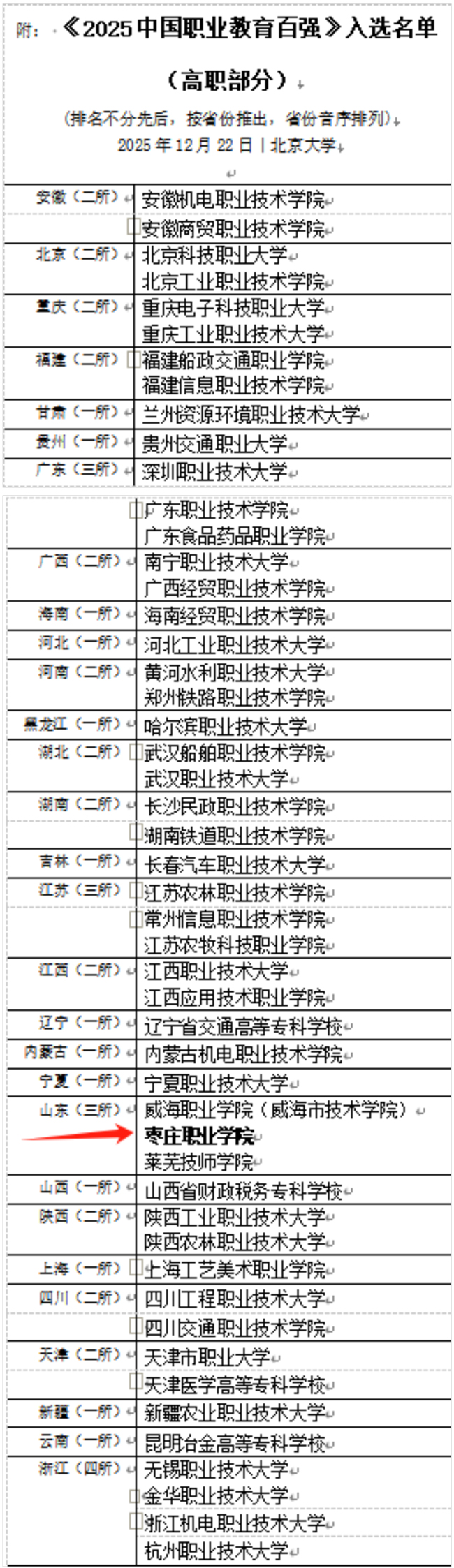 近日,第九届《中国职业教育百强》在北京大学发布,其中高职院校、中职学校各50所。枣庄职业学院入选2025年“中国职业教育百强”高职50强。学校党委副书记、校长梁家和在发布会现场发表贺词。