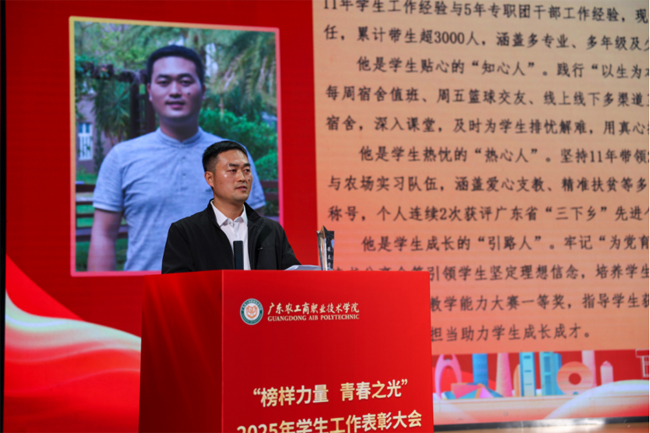 榜样引领时代,奋斗成就梦想。12月25日下午,广东农工商职业技术学院2025年“榜样力量 青春之光”学生工作表彰大会在粤垦校区学术报告厅隆重举行。学校党委委员、副校长陆璐明、相关职能部门负责人、各二级学院师生代表和学生家长代表共500余人齐聚一堂,共同见证过去一学年里涌现出的先进集体与优秀个人接受表彰。