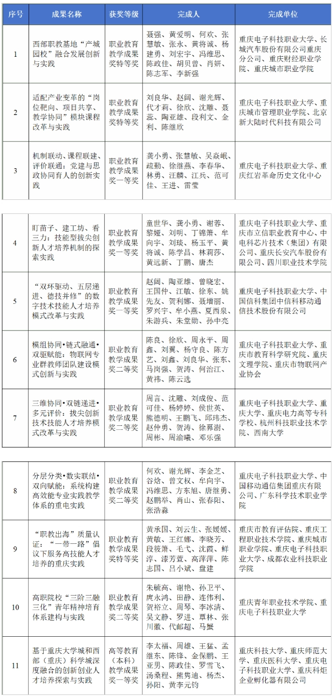 近日,重庆市人民政府发布《关于2025年重庆市教学成果奖励的决定》(渝府发〔2025〕17号),重庆电子科技职业大学共荣获市级教学成果奖11项。其中,作为第一完成单位荣获职业教育教学成果奖8项,包括特等奖2项、一等奖3项、二等奖3项,获奖数量居重庆市职业院校首位;另作为主要参与单位获教学成果奖3项,包括职业教育教学成果特等奖1项、二等奖1项及高等教育(本科)教学成果一等奖1项。
