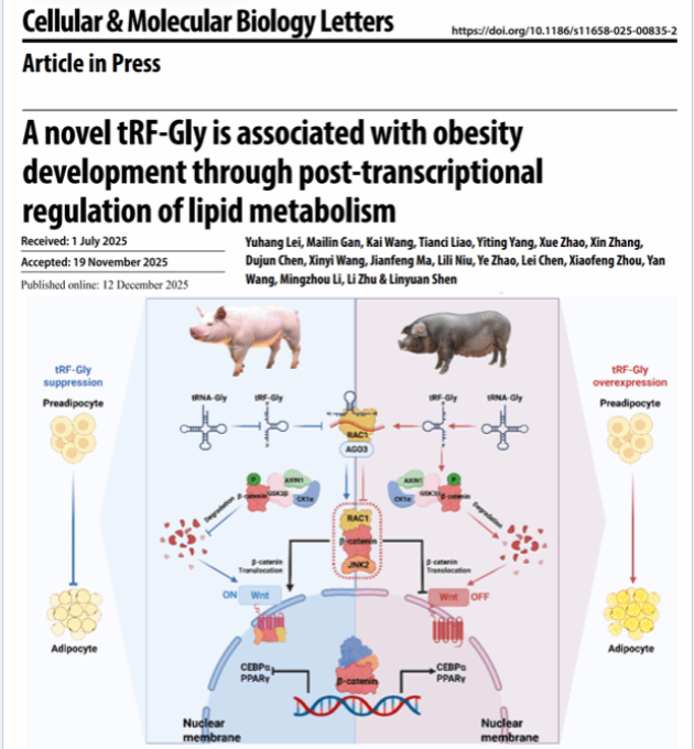 近日,四川农业大学朱砺教授团队在tRNA衍生小RNA(tsRNA)调控猪脂肪沉积的表观遗传机制研究领域取得重要进展,相关成果发表于国际权威期刊《细胞与分子生物学通讯》(Cellular & Molecular Biology Letters,IF = 10.2,一区TOP)和自然指数期刊Journal of Biological Chemistry。