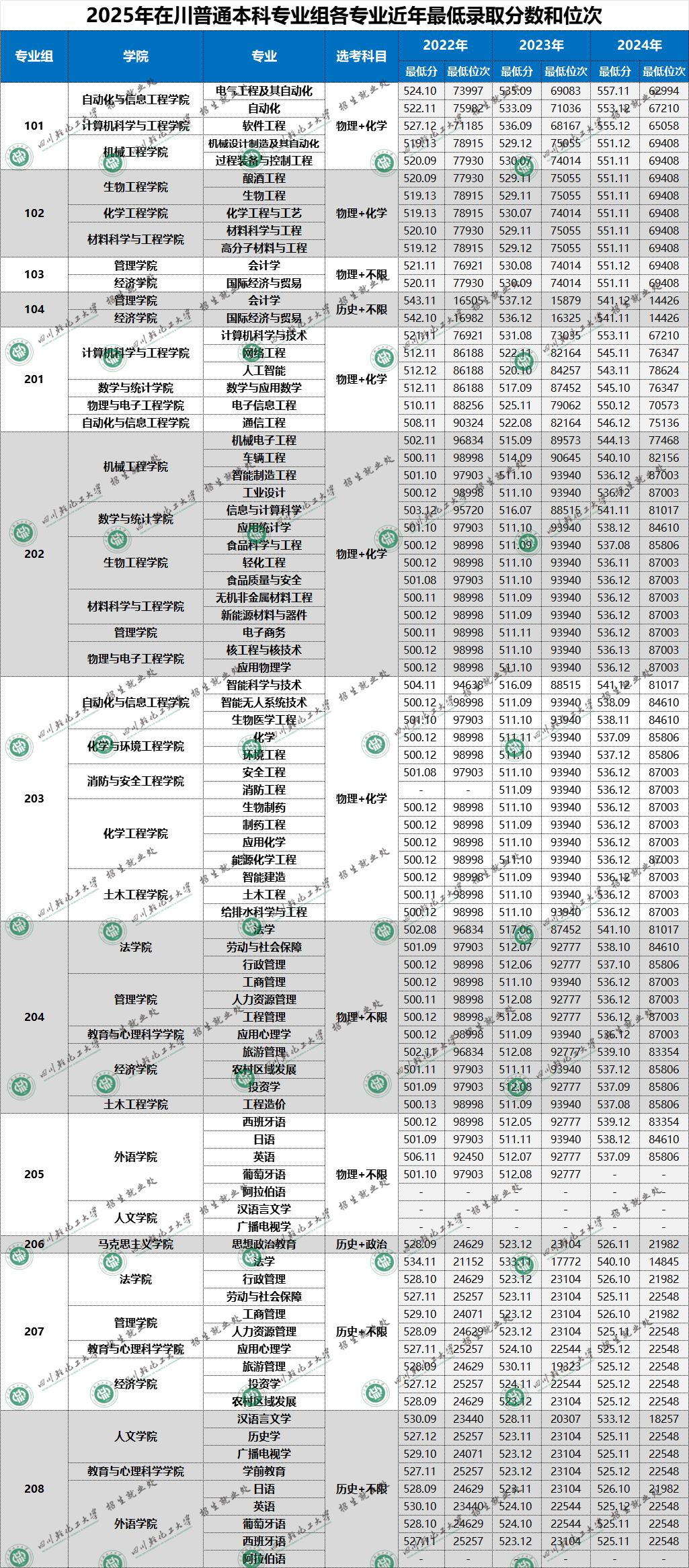 四川轻化工大学2025年在川普通本科专业组各专业近年最低录取分数和位次