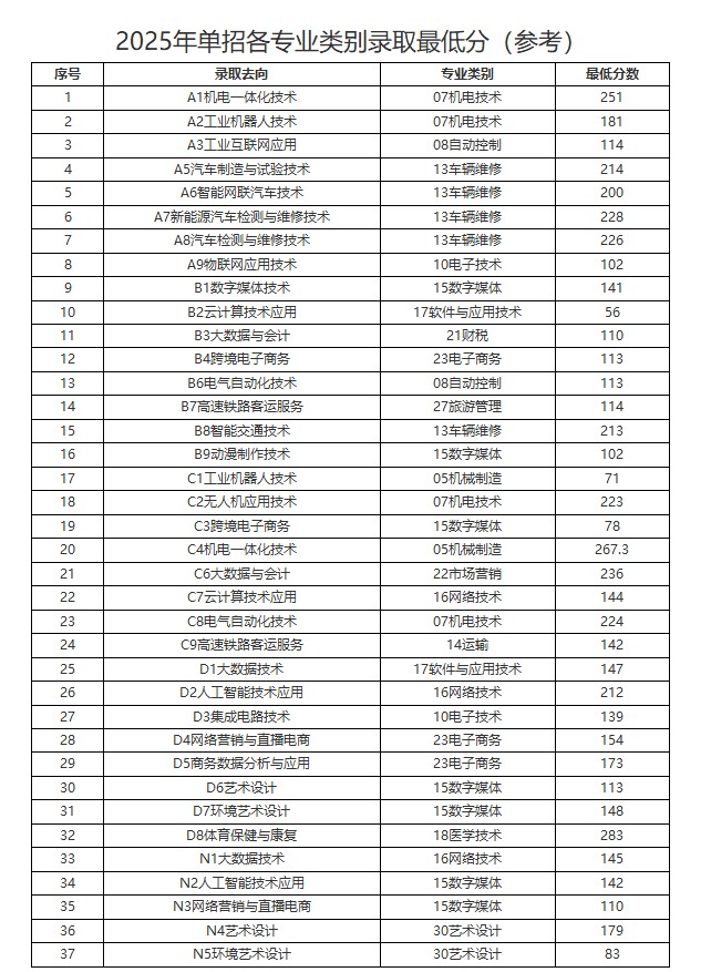 德州工程职业学院2025年单招各专业类别录取最低分(参考)