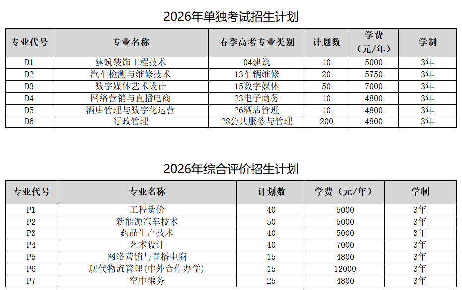 济宁职业技术学院2026年单独考试招生和综合评价招生计划