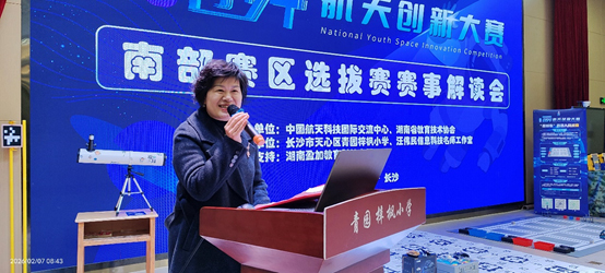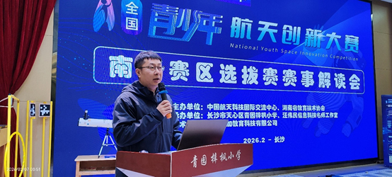 2月7日,由中国航天科技国际交流中心、湖南省教育技术协会联合主办的2026年全国青少年航天创新大赛南部赛区赛事解读会在长沙市天心区青园梓枫小学圆满举行。全国青少年航天创新大赛组委会办公室副主任张鑫睿,湖南省教育技术协会副会长兼秘书长李湘,湖南省教育技术协会专家委员会主任温安顺、学校应用专业委员会主任王劲松,长沙市天心区青园梓枫小学校长宋毅萍,副校长、南部赛区总裁判长汪伟民等出席会议,来自广东、广西、福建、湖南四省区的230余名教师参会。