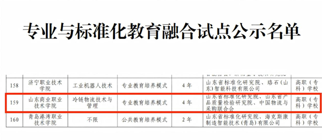 近日,国家市场监督管理总局、教育部联合发布了《关于专业与标准化教育融合试点名单的公示》,山东商业职业技术学院冷链物流技术与管理专业成功入选试点项目,充分彰显了山东商业职业技术学院在冷链物流领域职业教育的深厚积淀、鲜明特色与突出实力。