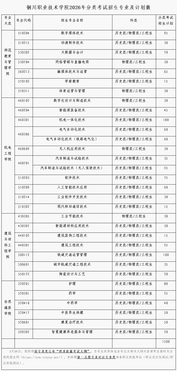 铜川职业技术学院2026年分类考试招生专业及计划数