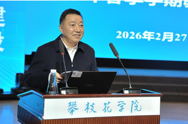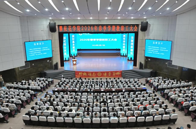 2月27日下午,攀枝花学院在阳光会堂召开全校教职工大会,会议以“全面贯彻落实党的二十届四中全会、省委十二届八次全会精神,深化综合改革,推进学科升级,抓好基本建设,全面提质增效,确保‘十五五’开好局起好步,加快建设阳光健康美丽的应用型一流大学”为主题,对2025年工作进行总结回顾,对2026年重点工作进行部署安排。在校校领导以及全校1000余名教职工参加会议。党委书记胥刚主持会议。