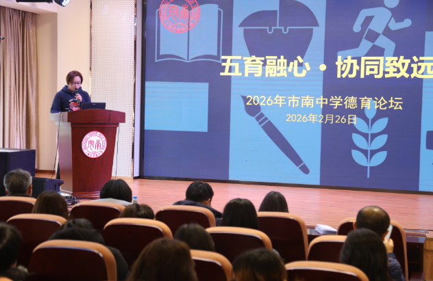 2026年2月26日,上海市市南中学德育论坛在热烈的氛围中隆重召开。 本次论坛以“五育融心·协同致远”为主题,围绕体育之刚、美育之柔、师者之爱、管理之智、心灵之护五个维度,共同探索立德树人的创新实践与深刻思考。五位教师代表结合自身工作实践,带来了精彩纷呈的分享。