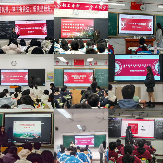 2026年1月至2月,法学院24支宣讲团队先后走进泸化中学、四川省绵竹中学、四川省武胜中学等20余所生源地高中,开展形式多样的招生宣讲活动,将西南医科大学的声音传递到巴蜀大地的各个角落。