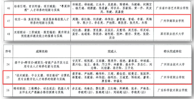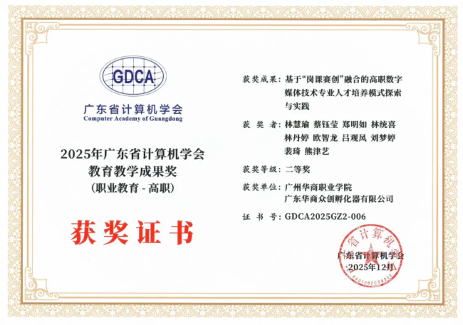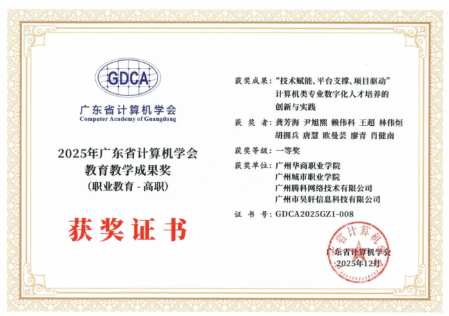 在广东省计算机学会职业教育教学成果奖评选中,学校作为第一完成单位共获一、二、三等奖各1项,彰显了学校在电子信息技术类专业数字化人才培养的特色与创新。