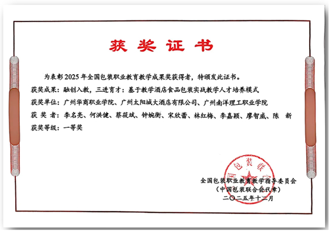 在全国包装职业教育教学指导委员会教学成果奖评选中,学校作为第一完成单位荣获一等奖1项,作为第二完成单位获特等奖1项,展现了学校在专业化、行业化教学改革中的领先水平。