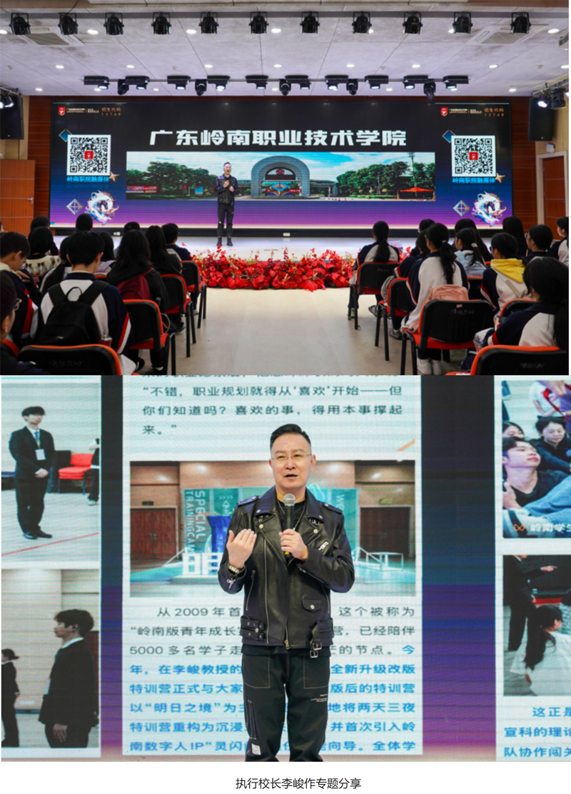 博雅报告厅内,执行校长李峻以“峻哥”身份亲切开讲。他以热门电影《浪浪山小妖怪》为切入点,将取经路上的成长困惑与青少年职业规划相联结,用贴近学生生活的语境剖析人生哲理,勉励学子们要勇敢、大胆往前走,做最好,最优秀的自己。他表示,岭南职院是广东省民办唯一一所高职示范性院校,办学水平稳居全省高职院校第一方阵,始终以市场需求为导向打造专业体系,快速布局时代热门专业,同步配齐师资、建好实训基地、完善课程体系,让学生所学与社会所需同频共振。