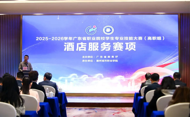 3月11日下午,由广东省教育厅主办、惠州城市职业学院承办的2025-2026学年广东省职业院校学生专业技能大赛(高职组)酒店服务赛项开幕式在惠州康帝国际酒店举行。来自全省34所高职院校的参赛选手、专家裁判及领队教师等100余人参加开幕式。