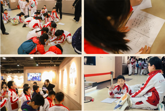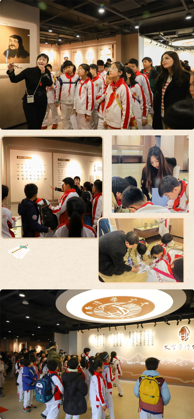 跟随讲解员的脚步,学生穿梭于各展厅之间,系统了解文字的起源、演变历程及其在中华文明传承中的作用,带领同学们梳理了汉字从甲骨文、金文、篆隶楷行草到现代规范字的演变脉络,逐步掌握了象形、指事、会意、形声……这些抽象的文字学核心概念,在生动的讲解中变得鲜活灵动,逐步掌握了汉字的构字规律。