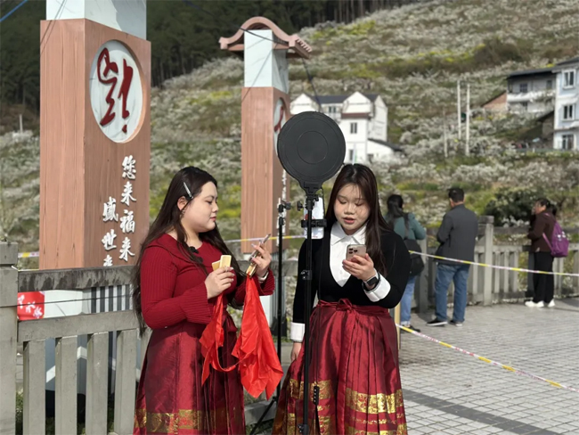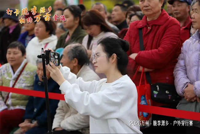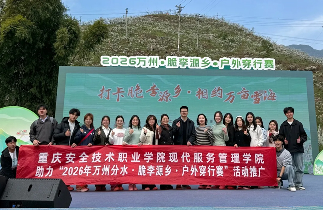 3月13日,重庆市万州区分水镇“2026万州・脆李源乡・户外穿行赛”火热开展。重庆安全技术职业学院现代服务管理学院受分水镇政府邀请,组织移动商务、网络营销与直播电商专业2024级学子,以直播和短视频创作方式开展宣传推广活动,为地方农文旅融合发展注入职教新动能。