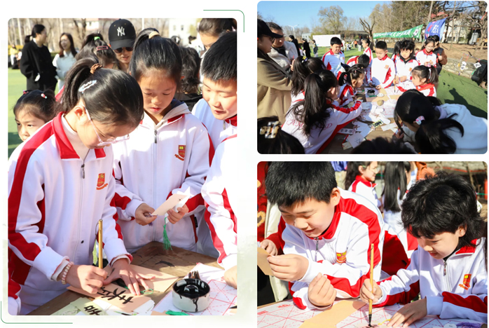 操场的书法体验区里,杨老师正耐心指导孩子们书写春日的祝福。孩子们手握毛笔,在精致的书签上一笔一画写下“春风快乐”等充满春意美好寄语。
