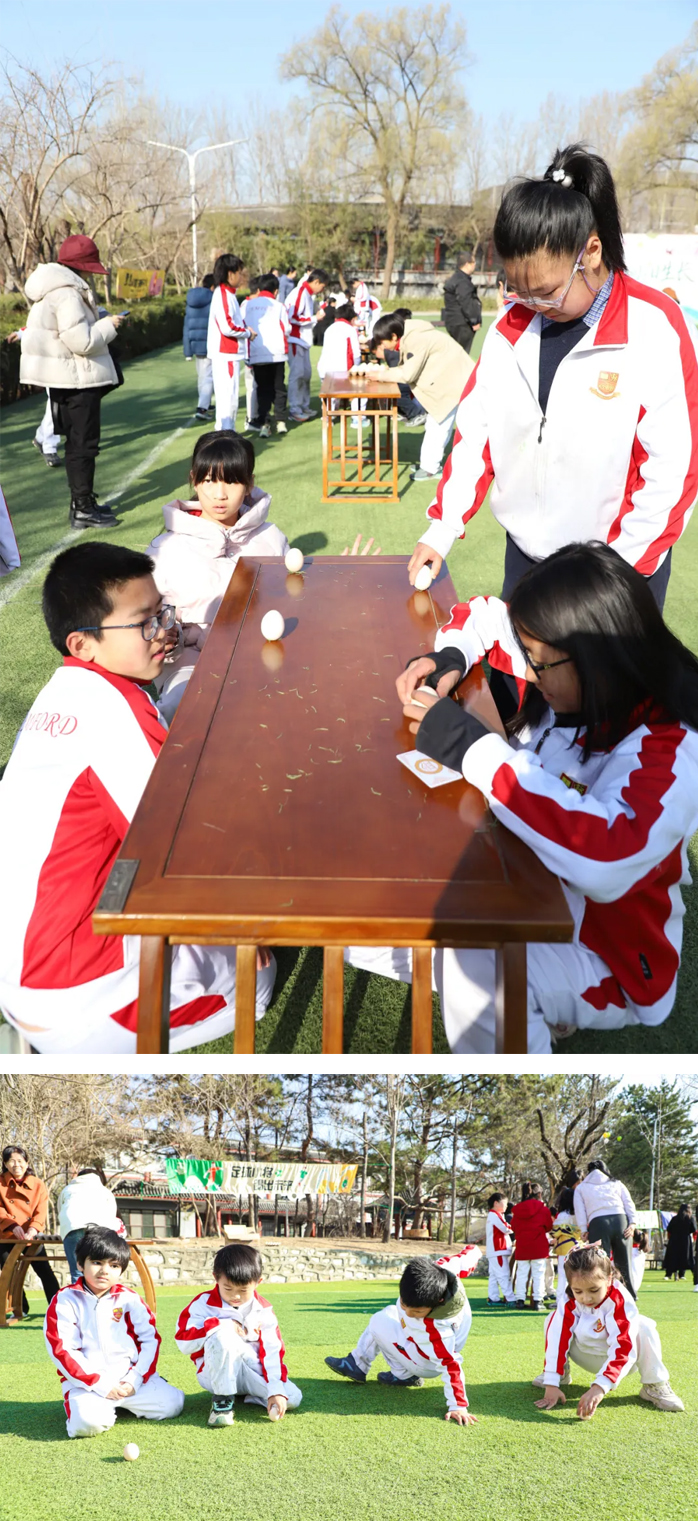 “春分到,蛋儿俏。”春分竖蛋是流传千年的趣味习俗。各班级在指定区域开展竖蛋体验,孩子们小心翼翼地将鸡蛋放在平整桌面,屏息凝神调整角度。有的孩子反复尝试不放弃,有的与同伴互相支招,当鸡蛋成功立起的瞬间,欢呼声此起彼伏。