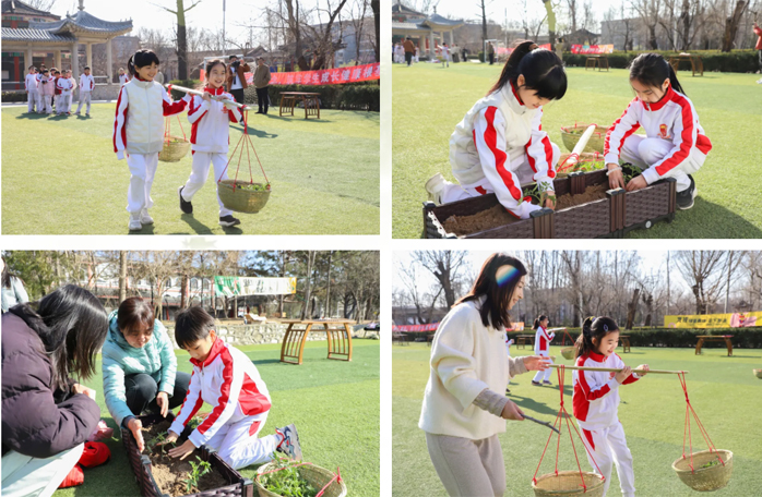 “加油!加油!” 操场上呐喊声、欢呼声此起彼伏,“春耕运苗接力赛” 正在火热进行。孩子们挑起装满番茄秧苗的扁担,在家长的辅助下快速奔向 “农田”,小心翼翼地将秧苗栽种到指定菜箱,再迅速返回接力。没有家长陪伴的孩子,与小伙伴自发组队协作,展现出极强的团队合作精神。