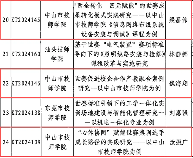 其中,由梁嘉伟老师主持的《“两全转化 四元赋能”世赛成果转化模式实践研究——以中山市技师学院〈信息网络布线系统设备安装与调试〉课程为例》获评省级优秀课题,中山市技师学院也因此成为本次评审中成果亮眼、表现突出的院校之一。三项课题紧密对接世界技能大赛先进标准与优质资源,系统探索世赛成果落地转化的有效路径,充分展现了学院在深化产教融合、推进技能竞赛成果赋能教育教学方面的扎实成效。