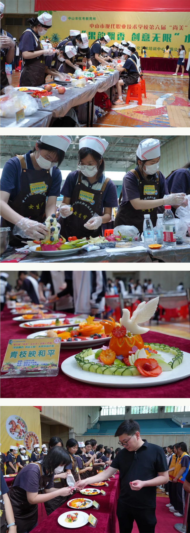 3月26日下午,“果韵飘香,创意无限”水果拼盘比赛在三乡校区体育馆举行。来自两校区的70支队伍、204名同学同台竞技,在60分钟内完成主题拼盘创作。比赛现场果香四溢,创意纷呈,作品或典雅精致,或活泼灵动,充分体现了学生的动手能力与团队协作精神。比赛还设置了最佳创意奖、最佳造型奖等多个奖项,进一步激发了学生的创作热情。