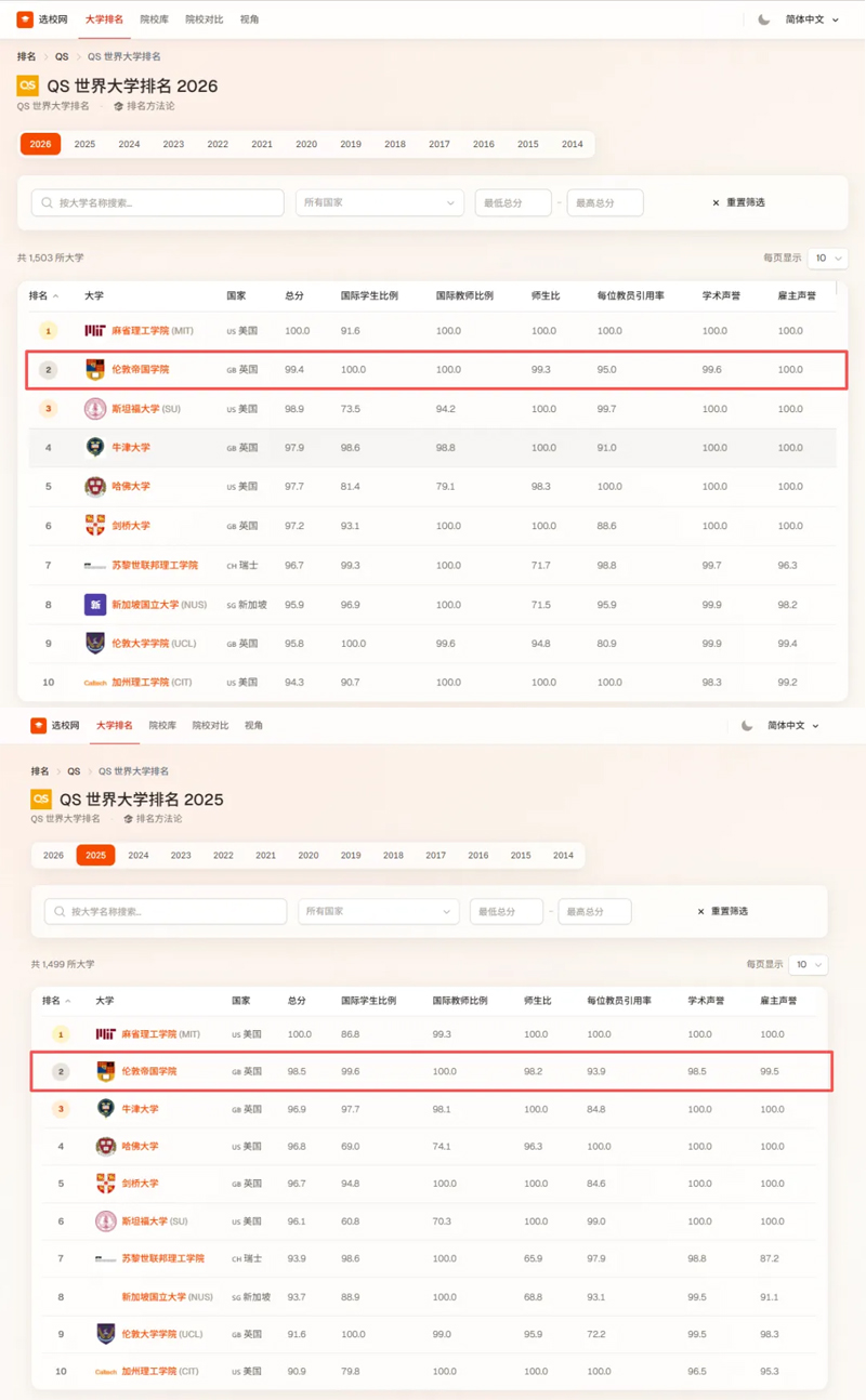 帝国理工学院在2025年、2026年QS全球大学排名