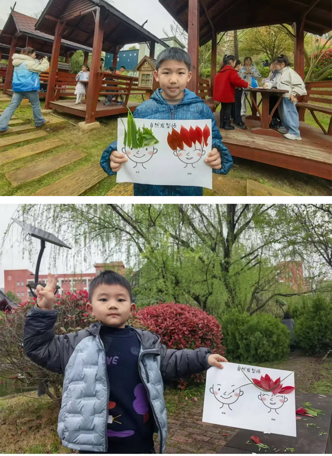 开班仪式后,校领导们化身“孩子王”,带领孩子们走进校园静心湖畔,一起认识大自然。柳树发了新芽,樱花开了满枝,湖里的锦鲤悠闲游弋……“这是香樟树,它的叶子可以驱虫哦!”“快看,那只小鸟在筑巢!”校党委书记宋选文蹲下身,耐心地为孩子们讲解每一种植物的名字和特点,还和孩子们一起捡拾落叶、花瓣等,为接下来的植物贴画收集素材。