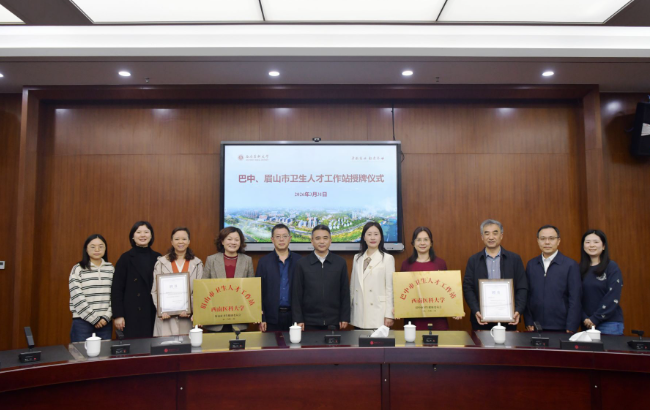同日下午,在城北校区一会议室,举行了巴中市、眉山市卫生人才工作站授牌仪式。学校党委副书记蒋通荣、巴中市卫健委副主任胥菊华、眉山市卫健委四级调研员李君明以及相关人员共11人参加。该校地共建卫生人才工作站机制,将有力加强当地卫生健康人才队伍建设,促进学校毕业生高质量充分就业。