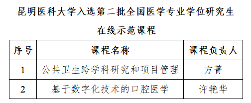 近日,全国医学专业学位研究生教育指导委员会公布了第二批全国医学专业学位研究生在线示范课程认定结果,昆明医科大学《公共卫生跨学科研究和项目管理》《基于数字化技术的口腔医学》两门课程入选。