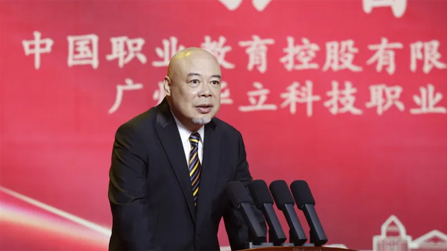 学校董事长张智峰在致辞中向莅临今天庆典的各位嘉宾表示了热烈的欢迎!他深情回顾了广州华立科技职业学院自1999年创办以来的辉煌历程与非凡成就。从最初的广州华立专修学院,到2005年正式升格为广州华立科技职业学院,学校历经风雨,却始终坚守初心,矢志不渝。如今,华立职院已发展成为一所拥有广州、云浮两大校区,涵盖53个招生专业,在校生人数接近2.5万人的综合高校,实现了办学规模与办学质量的双重飞跃。通过紧密结合市场需求,不断优化专业结构,学校的人才培养质量和品牌影响力得到了大幅提升。学生就业率连续五年高达97%以上,稳居全省高职院校前列,这充分展示了华立职院在人才培养方面的卓越实力。展望未来,张智峰董事长对学校的发展充满了信心和期待。他希望广州华立科技职业学院能够继续秉承“崇德、求是、博学、笃行”的校训精神,坚定不移地走内涵发展、特色发展、质量发展之路。他坚信,在全体师生员工的共同努力下,华立职院必将稳步迈向“双高校”和职业本科大学的目标,为打造国内知名、省内领先、特色鲜明的百年名校而努力奋斗!
