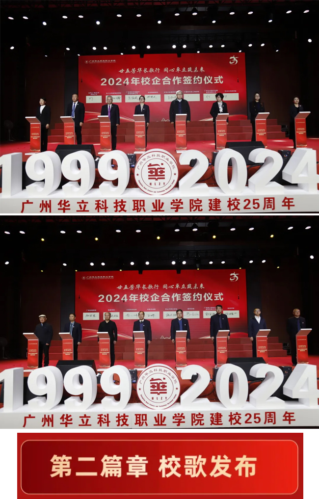 2024年12月8日上午10点,广州华立科技职业学院2024年师生大合唱暨25周年校歌发布会在学校广州校区隆重举行。出席典礼的领导与嘉宾有中国职业教育控股有限公司董事会主席、广州华立科技职业学院董事长张智峰,广州华立科技职业学院董事叶雅明,董事长助理陈积斌;广州华立科技职业学院原院长朱有兰,原党委书记胡志先,原副院长杨爱云、吴庭万;广东轻工职业技术大学副校长廖俊杰 ,广东省华立技师学院校长邹康、副校长陈冰红等兄弟院校领导;同时,东莞市清溪医院党委书记李小伟 、广州和谐医院院长张宏星、北汽(广州)汽车有限公司党委副书记陶也、广东品商供应链有限公司董事长吴勇威、正佳企业集团有限公司总裁巨和平、广州乡村振兴基金控股集团副总裁何青倩、广州南方测绘科技股份有限公司总经理郭宝宇、华立中英文学校副校长唐志强等企业界精英也应邀出席。此外,学校校长易健民,党委书记陈良声,常务副校长马俊(同时担任典礼主持人),副校长高尧来、王洪艳,校长助理叶春桃、张剑锋等校领导以及校友会名誉会长冼斌 ,校友会秘书长冯永惠,校友会广州分会会长郭树发等校友代表也悉数到场,现场共有三千多师生共同见证了这一历史性时刻。学校还开通网上直播,将这份荣耀与喜悦分享给了更多的校友。典礼随着大合唱的悠扬旋律和校歌的正式发布,广州华立科技职业学院迎来了属于自己的荣耀时刻,也开启了新的篇章。