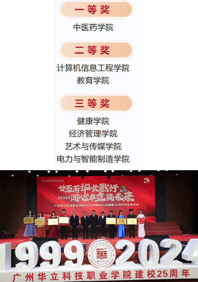 大合唱节目内容丰富、形式多样,展现了华立学子的青春风采、艺术才华与团结协作的精神,也标志着学校迈向新征程的坚定步伐。在合唱的尾声,学校领导为表演突出、组织有力的单位颁发了荣誉证书和奖杯,感谢他们为庆典的成功举办付出的努力。颁奖环节既是对参演者的肯定,也是对学校艺术氛围的再次彰显。
