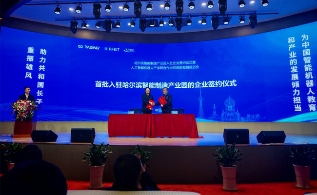 在上海太敬集团投资建设的哈尔滨智能制造产业园集中签约仪式上,校党委委员、副校长戴世明与上海太敬机器人股份有限公司总经理李文哲代表校企双方为项目签约。