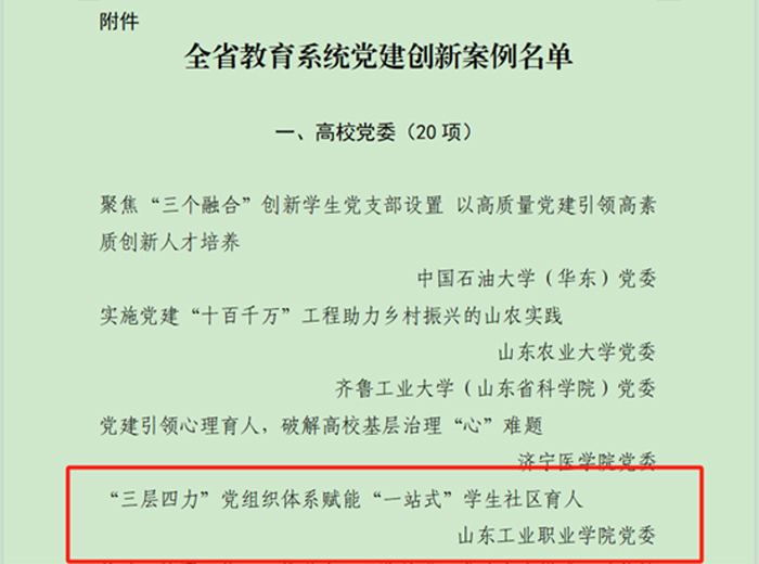 近日,山东省教育系统党建创新案例遴选结果公布,山东工业职业学院党委报送的“‘三层四力’党组织体系赋能‘一站式’学生社区育人”成功入选高校党委优秀案例(全省八所入选高职院校之一)。